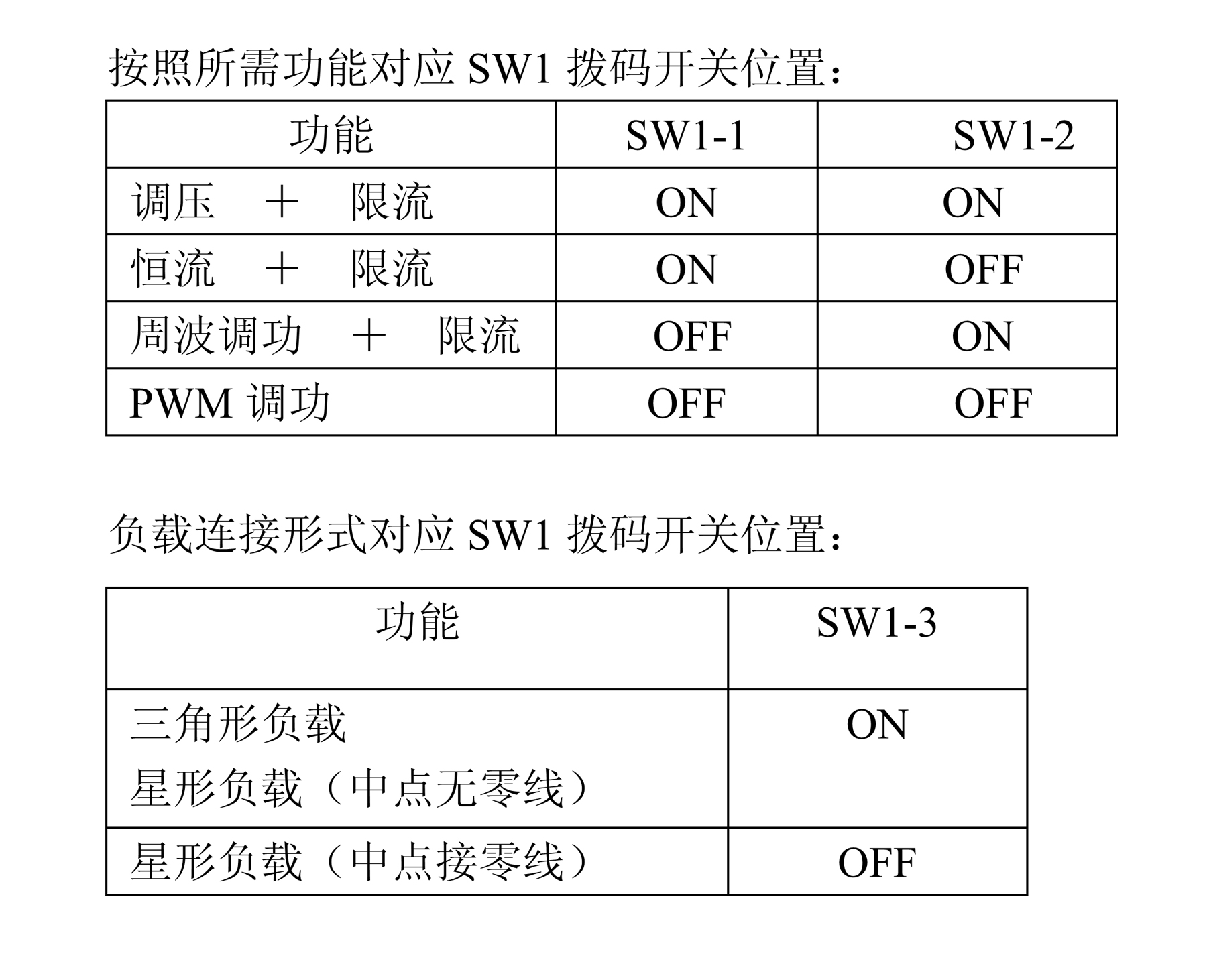 SW1-1=ON SW1-2=ON 時,調壓+限流。 SW1-1=ON SW1-2=OFF 時,恒流+限流。 SW1-1=OFF SW1-2=ON 時,周波調功+限流。 SW1-1=OFF SW1-2=OFF 是,PWM 調功(無限流功能)。 |