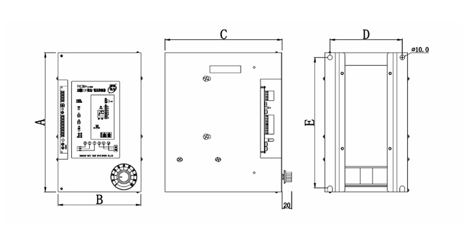 長360x寬246x厚243mm 4孔安裝, 孔距222*343mm 孔徑10mm |