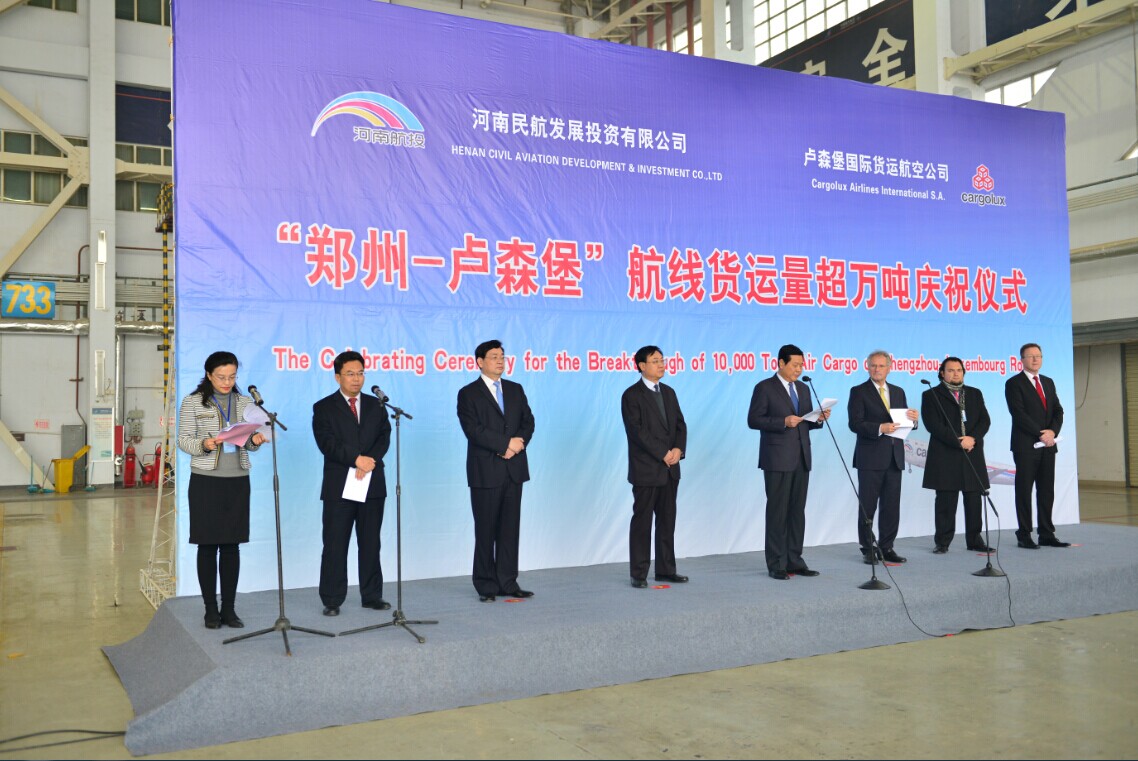 河南省副省長趙建才參加儀式并致辭,他指出,“鄭州-盧森堡”國際貨運(yùn)航線架起了橫貫中歐大陸的“空中絲綢之路”。“一路飛跨中歐,天塹變通途”,截至今日,該航線累計(jì)貨運(yùn)量已突破萬噸,為鄭州國際機(jī)場貨運(yùn)量的快速提升作出了突出貢獻(xiàn)!這一成績的取得,是河南省與盧貨航優(yōu)勢互補(bǔ)、合作共贏的成功典范,更是“雙樞紐”戰(zhàn)略推動(dòng)實(shí)驗(yàn)區(qū)發(fā)展的生動(dòng)實(shí)踐。當(dāng)前,鄭州航空港經(jīng)濟(jì)綜合實(shí)驗(yàn)區(qū)發(fā)展態(tài)勢良好,希望盧貨航與河南航投搶抓實(shí)驗(yàn)區(qū)戰(zhàn)略機(jī)遇,不斷拓寬合作領(lǐng)域,豐富合作內(nèi)容,加快推動(dòng)合資貨航組建和飛機(jī)維修基地建設(shè),積極培育參與國際分工合作新優(yōu)勢,努力促進(jìn)鄭州與盧森堡乃至歐亞之間的經(jīng)貿(mào)合作和人文交流,為建設(shè)鄭州航空港經(jīng)濟(jì)綜合實(shí)驗(yàn)區(qū)做出新的更大的貢獻(xiàn)。