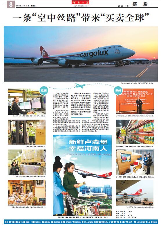 在8次報(bào)道中,既有會(huì)前的“熱身”宣傳,又有會(huì)中的集中點(diǎn)擊,還有會(huì)后的回顧追蹤,形成系列,精彩紛呈。13日,《河南日?qǐng)?bào)》以圖文并茂的整版篇幅,對(duì)河南航投與盧貨航的合作,尤其是“新鮮盧森堡”雙向跨境E貿(mào)易進(jìn)行了詳細(xì)報(bào)道。整個(gè)報(bào)道以新聞攝影為主,既有盧貨航“鄭州號(hào)”波音747-8F全貨機(jī),也有鄭-盧航線的專業(yè)操作流程展示,還有河南百姓采購“新鮮盧森堡”商品的真實(shí)場(chǎng)景……以鄭盧“雙樞紐”為典型案例,圍繞“一條‘空中絲路’帶來‘買賣全球’”這一主題,生動(dòng)展現(xiàn)了河南省依靠藍(lán)天對(duì)外開放的新思路和新成就。