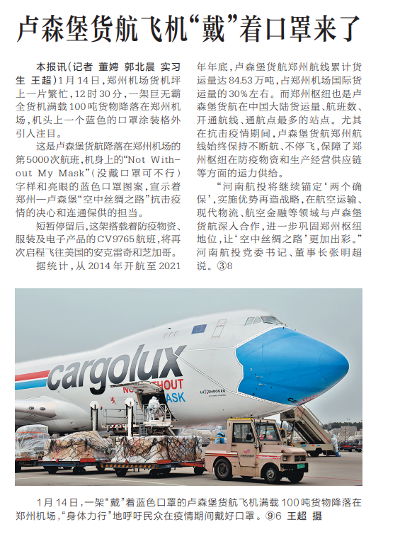 這是盧森堡貨航降落在鄭州機場的第5000次航班,機身上的“NotWith-outMyMask”(沒戴口罩可不行)字樣和亮眼的藍色口罩圖案,宣示著鄭州—盧森堡“空中絲綢之路”抗擊疫情的決心和連通保供的擔當。