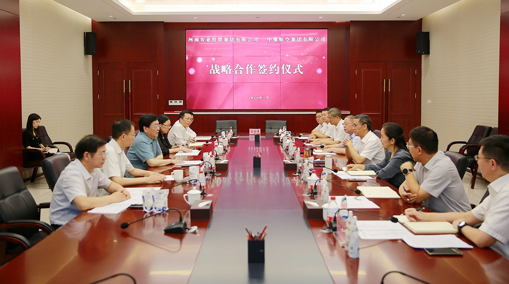 7月18日下午,中豫航空集團與河南農(nóng)投集團在農(nóng)投國際中心舉行工作會商,簽訂戰(zhàn)略合作協(xié)議。中豫航空集團黨委書記、董事長張明超;河南農(nóng)投集團黨委書記、董事長李曉寰,總經(jīng)理、副董事長張淑杰參加會談并見證雙方簽約。中豫航空集團副總經(jīng)理劉霞,河南農(nóng)投集團副總經(jīng)理張峰代表雙方簽署戰(zhàn)略合作協(xié)議。雙方相關(guān)業(yè)務(wù)負責(zé)人參加。