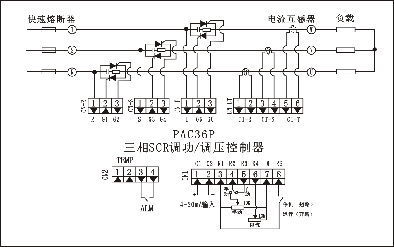 PAC36P系列:采用數(shù)字電路智能化設計,自動判別相位,力求接線簡單。高質(zhì)量要求,低于成本設計,其功能在PAC30A的基礎上增加了:電流反饋,使其具有:恒流、過流等功能,控制變壓器一次側等感性負載比較好。