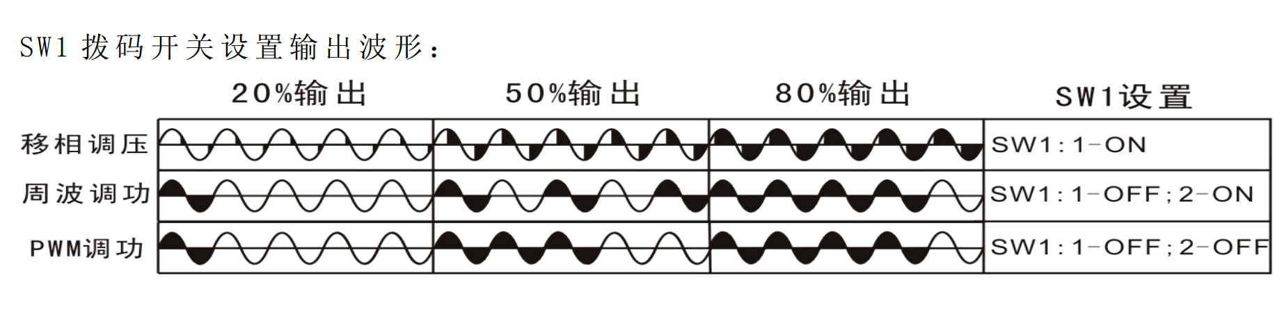 SW1-1=ON SW1-2=ON 時,調(diào)壓+限流。 SW1-1=ON SW1-2=OFF 時,恒流+限流。 SW1-1=OFF SW1-2=ON 時,周波調(diào)功+限流。 SW1-1=OFF SW1-2=OFF 是,PWM 調(diào)功(無限流功能)。 |
